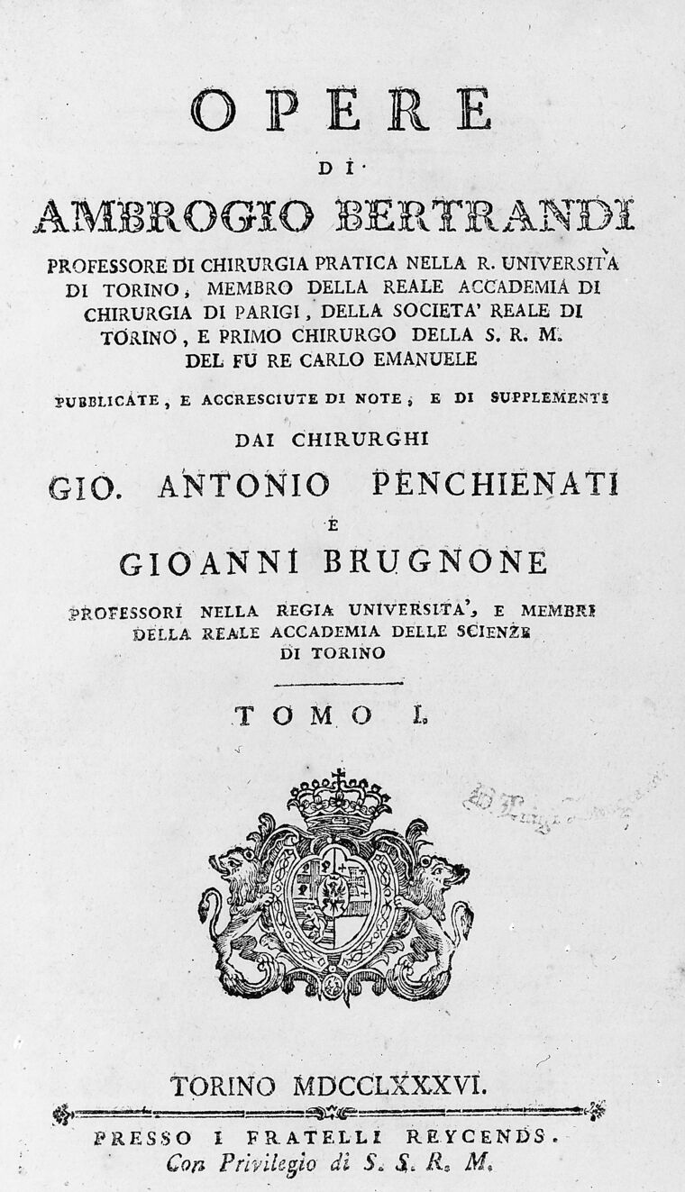 M0015615: Bertrandi: <i>Opere</i> volume I, 1786: title page. Public Domain Mark. Source: Wellcome Collection.