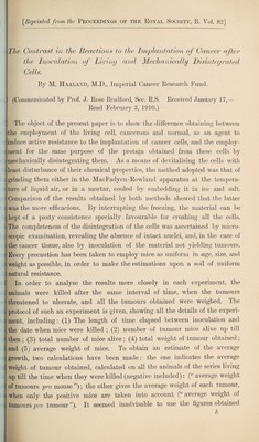 !['rom the Procekdinos of the Royal Society, B, Vol. 82, 1910.] he Contrast in the Reactions to the Implantation of Cancer after ie Inoculation of Living and Mechanically Disintegrated Cells. y M. HA ALAND, M.D.](https://iiif.wellcomecollection.org/image/b30616669_0001.jp2/full/800%2C/0/default.jpg)