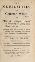 The curiosities of common water: or the advantages thereof in preventing and curing many distempers. Gather'd from the writings of several eminent physicians, and also from more than forty years' experience. To which are added, some rules for preserving health by diet / By John Smith. Public Domain Mark. Source: Wellcome Collection.
