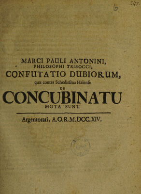 Marci Pauli Antonini, philosophi tribocci, Confutatio dubiorum, quae contra Schediasma Halense de concubinatu [by C. Thomasius] mota sunt.