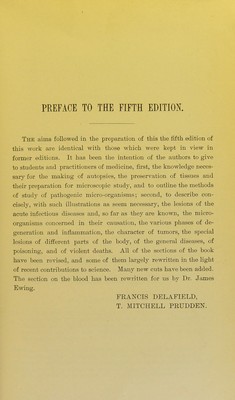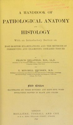 A handbook of pathological anatomy and histology : with an introductory section on post-mortem examinations and the methods of preserving and examining diseased tissues / by Francis Delafield and T. Mitchell Prudden.
