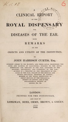 A clinical report of the Royal Dispensary for Diseases of the Ear : with remarks on the objects and utility of the institution / by John Harrison Curtis.
