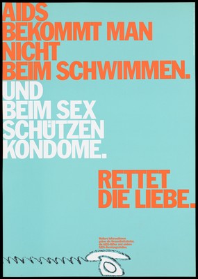 Credit: A white telephone advertising AIDS counselling services offered by health authorities and voluntary organizations; with the message ''AIDS does not come from swimming". Colour lithograph by Papen, Hansen, 199-. Source: Wellcome Collection.