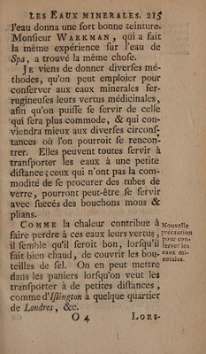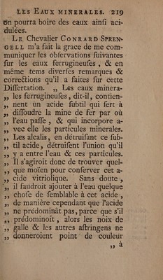 ![a l'eau. Tout comme on peut effa- » cer des lettres faites avec del’en-! cre,nefe fervant dujus de limon, ,, defprit de vitriol, &c. ainfi cette expérience nous montre quon ne: fauroit donner une teinture noire! avec des noix de galle, que lorf- que.le fer y prédomine. Le vi- triol verd fait l'encre feulement , par fon fer; c’eit auffi ce même fer, & non d’autres parties du vitriol qui teint les eaux minera- les ; car le vitriol bleu ne fait point l'encre. L’huile & l’efprit de vitriol changent le fer en vi- triol; mais avec cette différences que Phuile, verfée fur de la limu-. re de fer, forme du vitriol blanc, & l’efprit le change en vitriol verd. Le vitrioleft un fel moïen, le verd eft formé d’une fubftance 4, acide & d’une ferrugineufe, & le + spycbleu, elt compole de Cuivre... Obferva- . AVANT. que d’expofer les expés) tions fur riences & les obfervations qui fuis es eiprits 4 , - | acides -vent, il eft bon d’avertir que les ef da. -prits acides dont je me {uis fervi moi: me” . À 33 33 59 39 NBO 222 59 .99 29 99 >] 5, 99](https://iiif.wellcomecollection.org/image/b33019812_0001_0288.jp2/full/800%2C/0/default.jpg)