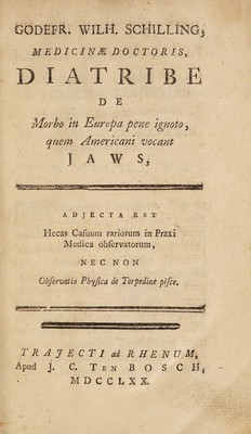 Diatribe de morbo in Europa pene ignoto, quem Americani vocant jaws, adjecta est hecas casuum rariorum ... observatorum, nec non observatio physica de torpedine pisce / [Godfried Wilhelm Schilling].