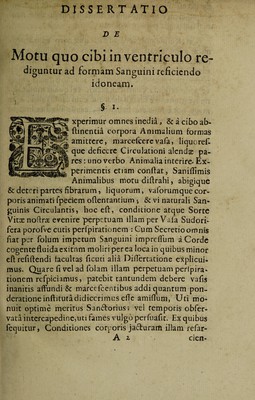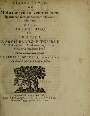 Credit: Dissertatio de motu quo cibi in ventriculo rediguntur ad formam sanguini reficiendo idoneam ... / Praeside D. Archibaldo Pitcairne M.D. ... Publicè defendendam suscipit Hubertus Deckers. Source: Wellcome Collection.