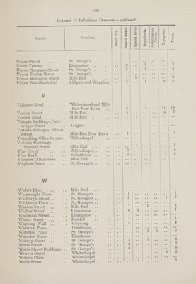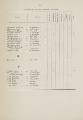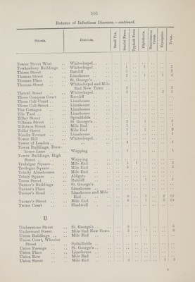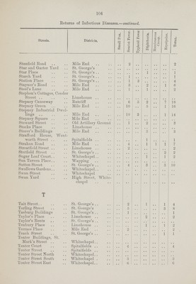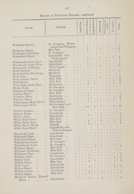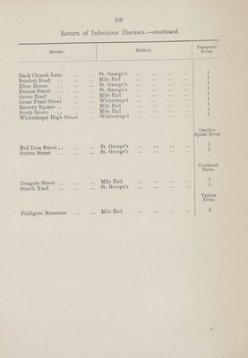 ![109 Return of Infectious Diseases.—continued. ]Streets. District. Puerperal Fever. Back Church Lane St. George's 1 Burdett Eoad Mile End 1 Ellen House St. George's 1 Fenton Street St. George's 1 Grove Eoad Mile End 1 Great Pearl Street Whitechapel 1 Eectory Square Mile End 1 South Grove .. Mile Eni 1 Whitechapel High Street Whitechapel 1 Cerebro spinal Fever. Eed Lion Street St. George's 1 Sutton Street St. George's 1 Continued Fever. Dongola Street Mile End 1 Starch Yard St. George's 1 Typhus Fever. Fieldgate Mansions Mile End 2](https://iiif.wellcomecollection.org/image/b19822716_0138.jp2/full/800%2C/0/default.jpg)