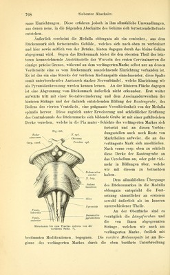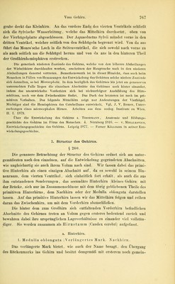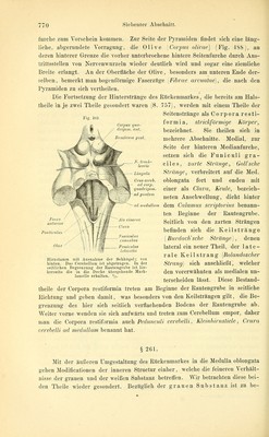 ![getretenen Lageverändernng spricht sich eine allmählich erlangte Selbständig- keit des Fornix aus. Dadurch aber, dass der Sehhügel nicht völlig frei in den Seitenventrikel ragt, sondern noch theilweise von der Tela chorioides überdeckt wird, ist das ursprüngliche Verhalten noch angedeutet. Das Septum pellucidum, dessen Lage bereits oben angegeben, verbin- det vorne den Balken mit den Säulen des Gewölbes (Fig. 504) und umschließt mit seinen beiden Lamellen einen verticalen, spaltähnlichen Raum, den Ventriculus septi pellucidi (vergl. Fig. 501 wo dieser Ventrikel auf dem horizontalen Durch- schnitt zu sehen ist. Auch in Fig. 509 ist das Septum pellucidum sichtbar). Der Binnenraum ist in der Regel auf einen minimalen umfang beschränkt, so dass man sich beide Lamellen des Septums einander berührend vorstellen mag. Mit den übrigen Ventrikeln des Gehirns hat er keinerlei Zusammenhang, und ist auch ganz anders als diese aufzufassen; er stellt vielmehr eine von der Ober- fläche her, und zwar von der Lamina terminalis gebildete Einsenkung vor, die mit der Entfernung des Balkens vom Fornix sich gestaltete und ihre Seitenwände in die beiden Lamellen des Septum übergehen ließ. Mit dem Fornix steht das als Hippocampus [H. major, Pes hippo- ccimpi major] oder Ammonshorn oben vorgeführte Gebilde in engster Ver- bindung. Dieser Theil erhebt sich beim Übergang des Fornix in die Fimbria mit einer gegen das Lumen des Seitenventrikels gerichteten Wulstung und be- gleitet die um den Sehhügel verlaufende sogenannte Fissura transversa cerebri. Daraus rfesultirt die allgemeine Form dieses Gebildes, welches medial concav, lateral convex sich darstellt (Fig. 505). Nach abwärts nimmt die Wölbung des Ammonshorns zu, und sein Ende ist in der Regel bedeutend verdickt, lateral mit einigen Einbuchtungen versehen, welche mehrere Vorsprünge [Digitationes) von einander abgrenzen. Der Körper des Ammonshornes entspricht in der Haupt- sache der Rindenschichte des Großhirns und bildet eine eingerollte Lamelle, die an ihrer Begrenzungsfläche der Fissura transversa vom Fornix nicht nur einen weißen Überzug empfing, sondern auch noch die Fimbria aufgelagert hat. Der unterhalb der letzteren, an der concaven Seite des Ammonshorns befindliche Theil des Körpers bietet wieder graue, sogar leicht gelbliche Färbung und zeigt eine Crenelirung, die ihm den Namen Fascia dentata [F. d. Tarini) verlieh. Indem die Fimbria die Fascia dentata begleitet, treten in beiden obere und untere Theile des primitiven Randbogens wieder in nachbarliche Beziehungen. 3. Seitenventrikel und Streifenkörper. §271. Die beiden Seitenventrikel haben wir oben (S. 764. 790) als Differenzirungen des ursprünglich einheitlichen Binnenraums der Vorderhirnblase kennen gelernt, sahen in ihnen Anpassungen des Binnenraums an die bilaterale Entfaltung des Großhirns. In ähnlicher Weise sind die Ausbuchtungen zu verstehen, welche](https://iiif.wellcomecollection.org/image/b21053959_0821.jp2/full/800%2C/0/default.jpg)