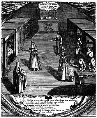 Credit: M0013371: Illustration of mealtime in a ward of the Hotel Dieu, Paris. Source: Wellcome Collection.
