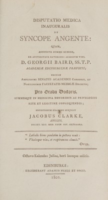 Disputatio medica inauguralis de syncope angente / [James Clarke].