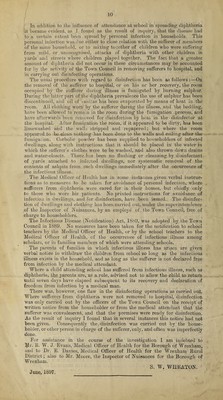 ![f . ,. , , In addition to the influence of attendance at school in spreading diphtheria it became evident, as I found as the result of inquiry, that the disease had to a certain extent been spread by personal infection in households. This personal infection was due either to close relation with the sufferer of members of the same household, or to mixing together of children who were suffering from mild, or unrecognised, attacks of diphtheria with other children in yards and streets where children played together. The fact that a greater amount of diphtheria did not occur in these circumstances may be accounted for by the activity of the Town Council in removing sufferers to hospital, and in carrying out disinfecting operations. The usual procedure with regard to disinfection has been as follows —On the removal of the sufferer to hospital, or on his or her recovery, the room occupied by the sufferer during illness is fumigated by burning sulphur. During the latter part of the diphtheria prevalence the use of sulphur has been discontinued, and oil of f anitas has been evaporated by means of heat in the room. All clothing worn by the sufferer during the illness, and the bedding, have been allowed to remain in the room during the fumigation process, and have afterwards been removed for disinfection by heat in the disinfector at the hospital. After fumigation the room, if it appeared to be dirty, has been limewashed and the walls stripped and repapered; but where the room appeared to be clean nothing has been done to the walls and ceiling after the fumigation. Garbo]ic powder has been supplied to householders of infected dwellings, along with instructions that it should be placed in the water in which the sufferer’s clothes were to be washed, and also thrown down drains and water-closets. There has been no flushing or cleansing by disinfectant of yards attached to infected dwellings, nor systematic removal of the contents of ashpits from such dwellings immediately after the occurrence of the infectious illness. , , The Medical Officer of Health has in some instances given verbal instruc¬ tions as to measures to be taken for avoidance of personal infection, where sufferers from diphtheria were cared for in their homes, but chiefly only to those who were his patients. No printed instructions for avoidance of infection in dwellings, and lor disinfection, have been issued. The disinfec¬ tion of dwellings and clothing has been carried out, under the superintendence of the Inspector of Nuisances, by an employe of the Town Council, free of charge to householders. The Infectious Disease (Notification) Act, 1889, was adopted by the Town Council in 1889. No measures have been taken for the notification to school teachers by the Medical Officer of Health, or by the school teachers to the Medical Officer of Health, of the occurrence of infectious illness among scholars, or in families members of which were attending schools. The parents of families in which infectious illness has arisen are given verbal notice to withdraw the children from school so long as the infectious illness exists in the household, and as long as the sufferer is not declared free from infection by the medical attendant. Where a child attending school has suffered from infectious illness, such as diphtheria, the parents are, as a rule, advised not to allow the child to return until seven days have elapsed subsequent to its recovery and declaration of freedom from infection by a medical man. There was, however, one flaw in the disinfecting operations as carried out. Where sufferers from diphtheria were not removed to hospital, disinfection was only carried out by the officers of the Town Council on the receipt of written notice from the householder or from the medical attendant that the sufferer was convalescent, and that the premises were ready for disinfection. As the result of inquiry I found that in several instances this notice had not been given. Consequently the disinfection was carried out by the house¬ holder, or other person in charge of the sufferer, only, and often was imperfectly done. For assistance in the course of the investigation I am indebted to Mr. R. W. J. Evans, Medical Officer of Health for the Borough of Wrexham, and to Dr. E. Davies, Medical Officer of Health for the Wrexham Rural District; also to Mr. Moore, the Inspector of Nuisances for the Borough of Wrexham. S. W. WHEATON. June, 1897.](https://iiif.wellcomecollection.org/image/b30557689_0010.jp2/full/800%2C/0/default.jpg)