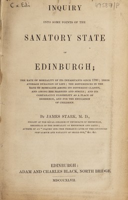 Inquiry into some points of the sanatory state of Edinburgh; the rate of mortality of its inhabitants since 1780; their average duration of life; the difference in the rate of mortality among its different classes, and among the married and single; and its comparative eligibility as a place of residence, and for the education of children / [James Stark].