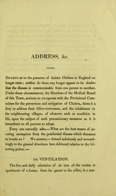 Credit: Address, to the inhabitants of Sheffield and the neighbourhood on the cholera morbus / prepared by the Medical Board, at the request of the Provisional Committee. Source: Wellcome Collection.
