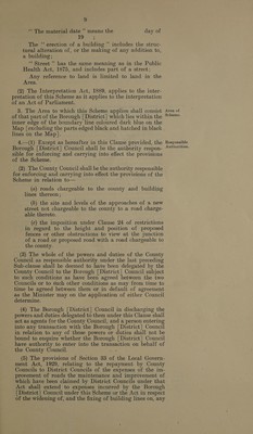 ![/' TOWN AND COUNTRY PLANNING ACT, 1932. Model Clauses. PART I.—GENERAL. 1. This Scheme may be cited as the Planning Scheme and is divided into the following Parts :— Part I ... General. Part II .... Reservation of Lands. Part III... Streets and Building Lines. Part IV... Building Restrictions and Use of Land. Part V .... General Amenity and Convenience. Part VI... Provisions as to maintenance, use, alteration, extension, and replace- ment of Existing Buildings and continuance of Existing Use of Land. Part VII... Miscellaneous. 2.—(1) In this Scheme, except where the context otherwise requires or it is otherwise expressly provided, the following words and expressions have the respective mean- ings hereby assigned to them :— “ The Borough [District] ”’ means the “ The Borough [ District | Council ’ means the ; ‘“ The County Council ”’ means the ~ “The Council’? means in relation to any provision _ of this Scheme the authority responsible for enforcing and carrying into effect that provision; ‘* The Minister ” means the Minister of Health; _“ The Act ” means the Town and Country Planning Act, 1932 (22 and 23 Geo. V, c. 48); ‘““The Regulations ” means the Regulations made by the Minister under Section 37 of the Act and for the time being in force in the Borough | District]; “The Map ” means the map which has been pre- pared in duplicate, each map being sealed with the official seal of the Minister and with the common seal of the Council, and marked ‘‘ Map referred to in the Planning Scheme,” of which one is deposited in the office of the Minister and the other in the offices of the Council; ** The Area ” means the area described in Clause 3; ‘“ Interim development order” includes an order relating to interim development made under any Act repealed by the Act; 0 ‘““ The byelaws and local Acts” means the bye- laws, local Acts, orders or regulations for the time being in force in the Area; ‘“‘ Person having control ” in relation to any land or building means the person who receives the rack-rent of the land or building, whether on his own account or as agent or trustee for any other person, or who would so receive it, if the land or building were let at a nack-rent; 28591 A 4 Short title and arrange- ment of Scheme. Interpreta- tion.](https://iiif.wellcomecollection.org/image/b3217178x_0007.jp2/full/800%2C/0/default.jpg)
