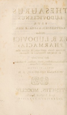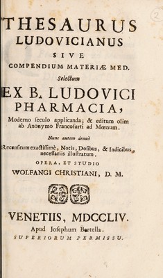 Thesaurus Ludovicianus sive compendium materiae med[icae] selectum ex B. [Dan] Ludovici Pharmacia, moderno seculo applicanda / [by Daniel Nebel] ... Nunc autem denuo recensitum ... notis, etc. illustratum. Opera, & studio W. Christiani.