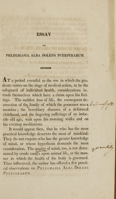 An inaugural dissertation, on phlegmasia alba dolens puerperarum : submitted to the consideration of the Hon. Robert Smith, provost ; and of the regents of the University of Maryland: for the degree of Doctor of Physick / by Charles S. Davis, of Baltimore County, honorary member of the Baltimore Medical Society.