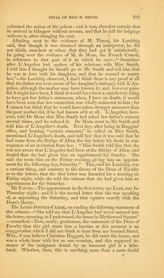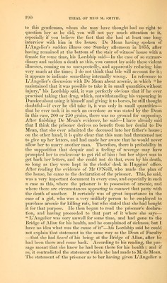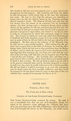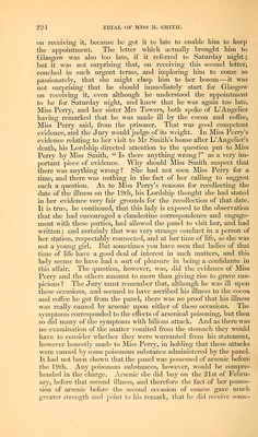 ![on receiving it, because lie got it to late to enable liim to keep the appointment. The letter which actually brought him to Glasgow was also too late, if it referred to Saturday night; but it was not surprising that, on receiving this second letter, couched in such urgent terms, and imploring him to come so passionately, that she might clasp him to her bosom—it was not surprising that he should immediately start for Glasgow on receiving it, even although he miderstood the appointment to be for Saturday night, and knew that he was again too late. Miss Perry, and her sister Mrs Towers, both spoke of L'Angelier having remarked that he was made ill by the cocoa and coffee, Miss Perry said, from the prisoner. That was good competent evidence, and the Jury would judge of its weight. In Miss Perry's evidence relating to her visit to ]SIr Smith's house after L'Ajigelier's death, his Lordship directed attention to the question put to Miss Perry by Miss Smith, Is there anything wrong 1 as a very im- portant piece of evidence. Why should Miss Smith suspect that there was anything wrong ? She had not seen Miss Perry for a time, and there was nothing in the fact of her calling to suggest such a question. As to Miss Perry's reasons for recollecting the date of the illness on the 19th, his Lordship thought she had stated in her evidence very fair grounds for the recollection of that date. It is true, he continued, that this lady is exposed to the observation that she had encouraged a clandestine correspondence and engage- ment with these parties, had allowed the panel to visit her, and had written; and certainly that was very strange conduct in a person of her station, respectably connected, and at her time of life, as she was not a young girl. But sometimes you have seen that ladies of that time of life have a good deal of interest in such matters, and this lady seems to have had a sort of pleasure in being a confidante in this affair. The question, however, was, did the evidence of Miss Perry and the others amount to more than giving rise to grave sus- picions ? The Jury must remember that, although he was ill upon these occasions, and seemed to have ascribed his illness to the cocoa and coffee he got from the panel, there was no proof that his illness was really caused by arsenic upon either of these occasions. The symptoms corresponded to the effects of arsenical poisoning, but then so did many of the symptoms with bilious attack. And as there was no examination of the matter vomited from the stomach they would have to consider whether they were warranted from his statement, however honestly made to Miss Perry, in holding that these attacks were caused by some poisonous substance administered by the panel. It had not been shown that the panel was possessed of arsenic before the 19th. Any poisonous substances, however, would be compre- hended in the charge. Arsenic she did buy on the 21st of Febru- ary, before that second illness, and therefore the fact of her posses- sion of arsenic before the second occasion of course gave much greater strength and point to his remark, that ho did I'cceivc some-](https://iiif.wellcomecollection.org/image/b21078324_0312.jp2/full/800%2C/0/default.jpg)