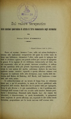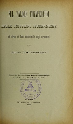 Credit: Sul valore terapeutico delle iniezioni ipodermiche di citrato di ferro ammoniacale negli eczematosi / Ugo Passigli. Source: Wellcome Collection.