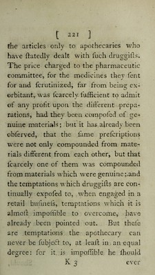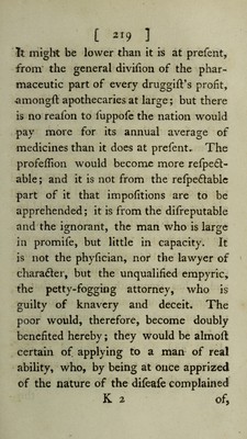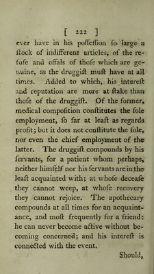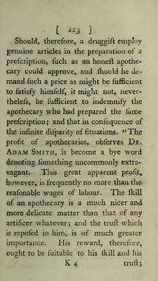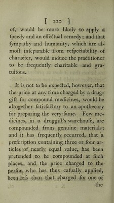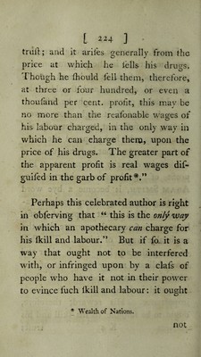 ![[ 22+ ] trull; and it arifes generally from the price at which he tells- his drugs. Though he fhould fell them, therefore, at three or four hundred, or even a thoufand per cent, profit, this may be no more than the reafonable wages of his labour charged, in the only way in which he can eharge them, upon the price of his drugs. The greater part of the apparent profit is real wages dif- guifed in the garb of profit*.” Perhaps this celebrated author is right in obferving that “ this is the only way in which an apothecary can charge for his Ikill and labour.” But if fix it is a way that ought not to be interfered with, or infringed upon by a clafs of people who have it not in their power to evince fuch Ikill and labour: it ought * Wealth of Nations. not](https://iiif.wellcomecollection.org/image/b28759059_0258.jp2/full/800%2C/0/default.jpg)