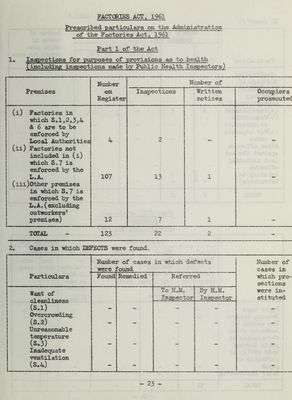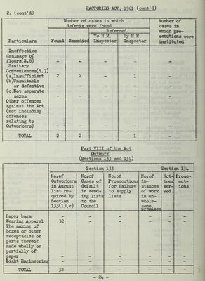 ![FACTORIES ACT, 1961 (cont°d) Number of cases in which Number of defects were found cases in Referred which pro- To HoM„ By H.M„ secutions were Particulars Found Remedied Inspector Inspector instituted Ineffective drainage of floors(S«6) Sanitary Conveniences(S„ 7] (a) lnsufficient (b) Unsuitable 2 2 1 or defective - - - - - (c)Not separate sexes - - - - - Other offences against the Act (not including offences relating to Outworkers) CB£> J _ TOTAL 2 2 - 1 Part VIII of the Act Outwork (Sections 133 and 134) Section 133 Section 15k No.Of Outworkers in August list re- quired by Section 133(l)(c) No. of Cases of default in send- ing lists to the Council No, of Prosecutions for failure to supply lists No. of in- stances of work in un- whole- some, nremises Not- ices ser- ved Prose- cut- ions Paper bags m. «=> — Wearing Apparel The making of boxes or other receptacles or parts thereof made wholly or partially of 32 paper - _ - - - - Light Engineering - = - - — TOTAL 32 - - - - -](https://iiif.wellcomecollection.org/image/b29431475_0048.jp2/full/800%2C/0/default.jpg)