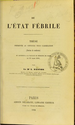 De l'état fébrile : thèse présentée au concours pour l'agrégation (section de médecine) et soutenue à la Faculté de médecine de Paris, le 12 mars 1866 / par L. Desnos.