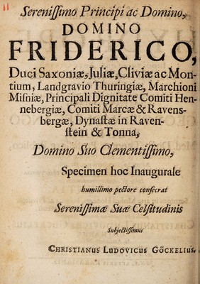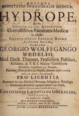 Credit: Disputatio inauguralis medica, de hydrope ... / [Christian Ludwig Göckel]. Source: Wellcome Collection.