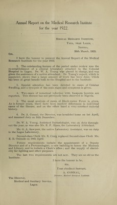 Annual report on the Medical Research Institute / 1909-.