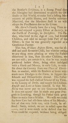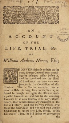 A genuine account of the life and trial of William Andrew Horne, of Butterly-Hall, in the County of Derby; who was convicted at Nottingham Assizes, August 10, 1759, for the murder of a child in the year 1724, and executed there on the 11th of December, 1759, to which is prefixed a particular detail of all the circumstances tending to the discovery of this long-concealed murder / [William Andrew Horne].