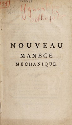 Credit: Nouveau manege méchanique, proposé pour les paralytiques, rhumatismes, goutes ... etc. ... avec un sommaire sur la nature du feu, qui n'est nullement un corps matériel à part / [Charles Rabiqueau]. Source: Wellcome Collection.