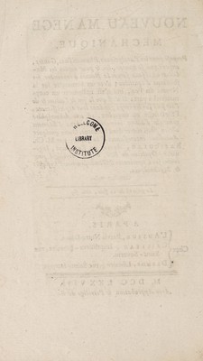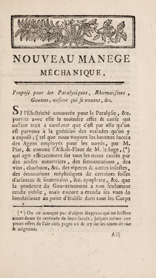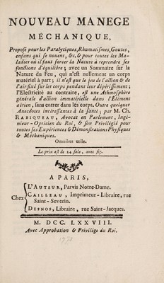 Nouveau manege méchanique, proposé pour les paralytiques, rhumatismes, goutes ... etc. ... avec un sommaire sur la nature du feu, qui n'est nullement un corps matériel à part / [Charles Rabiqueau].