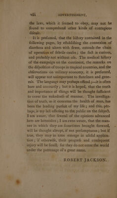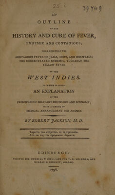 An outline of the history and cure of fever, endemic and contagious; more expressly the contagious fever of jails, ships, and hospitals; the concentrated endemic, vulgarly the yellow fever of the West Indies. To which is added, an explanation of the principles of military discipline and economy; with a scheme of medical arrangement for armies / [Robert Jackson].