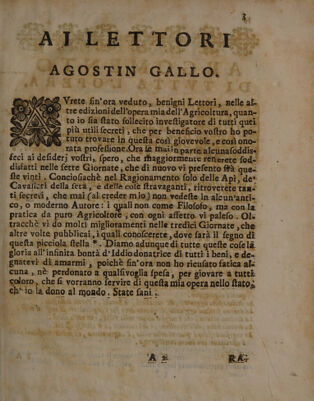 Venti giornate d'agricoltura ... Con nuova aggiunta in fine della xiii. giornata di diversi rimedii in proposito d'animali / Di M. Agostin Gallo ... ; le quali trattano del piacere, ed utile della villa.