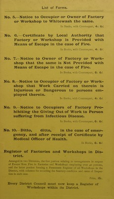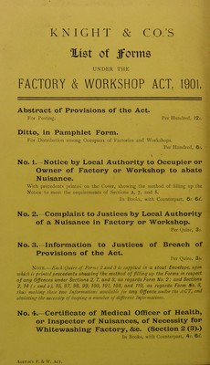 Credit: The law relating to factories and workshops : (the Factory and workshop act, 1901) (1 Edw. 7, ch. 22.) With appendix containing the special rules under the factory acts, 1891 & 1895. The Truck acts, 1831-1896, the Shop hours acts, 1892-1895, with notes. The text of the Workmen's compensation acts, 1897 & 1900 etc. etc. etc / by Evans Austin. Source: Wellcome Collection.