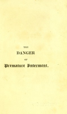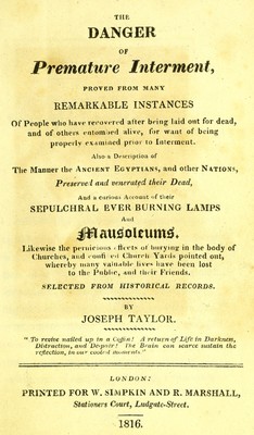 The danger of premature interment : proved from many remarkable instances ... : also a description of the manner the ancient Egyptians ... preserved ... their dead and a curious account of their sepulchral ever burning lamps and mausoleums ... / by Joseph Taylor.