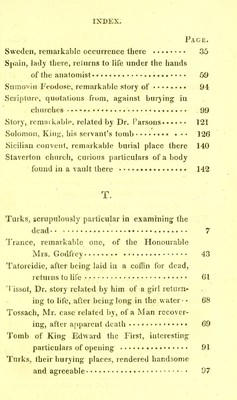 The danger of premature interment : proved from many remarkable instances ... : also a description of the manner the ancient Egyptians ... preserved ... their dead and a curious account of their sepulchral ever burning lamps and mausoleums ... / by Joseph Taylor.
