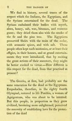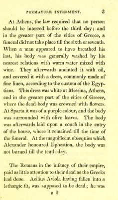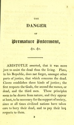 The danger of premature interment : proved from many remarkable instances ... : also a description of the manner the ancient Egyptians ... preserved ... their dead and a curious account of their sepulchral ever burning lamps and mausoleums ... / by Joseph Taylor.