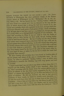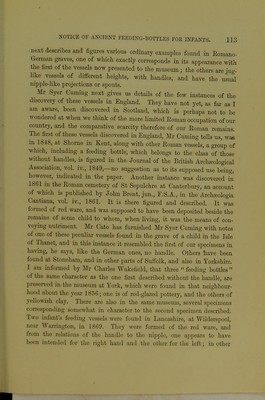 Notice of ancient "feeding bottles" for infants (one containing remains of milk, recently presented to the Museum of the Society) : with notes of the discovery of similar vessels in Gallo-Roman graves, and instances of their occurrence in England / by John Alexander Smith.