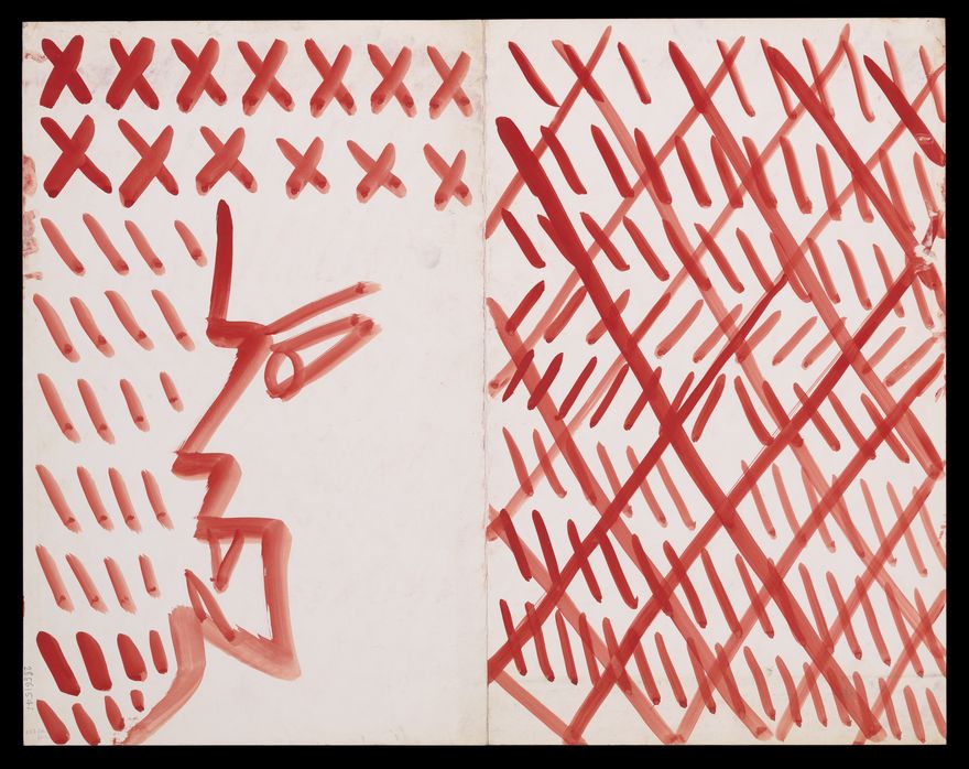 Red diagonal lines and crosses, and a face in profile