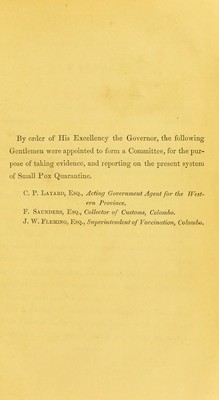 Report of the Small-pox Quarantine Committee, appointed by order of His Excellency the Governor, Colombo, May, 1851 : with appendices.
