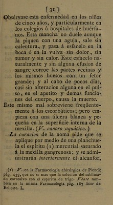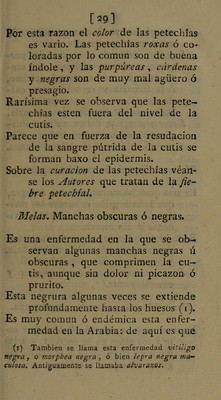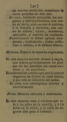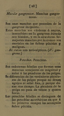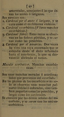 ![07] amoratadas, semejantes á las que de- xan los azotes ó latigazos. Sus especies son : 1. Cardenal por el azote ó latigazo, y se cura como el ecchimoma violento. 2. Cardenal escorbútico. (Véanse manchas escorbúticas.) 3. Cardenal febril. Estas rayas se obser- van en las fiebres pútridas, y se cu- ran como las petechías. 4. Cardenal por el panarizo. Dos veces he visto una raya encarnada que se extendía desde el dedo inflamado hasta el ante-brazo, la que se des- vaneció abriendo el tumor. Maculca scorbuticce. Manchas escorbú- ticas. Son unas manchas moradas ó acardena- ladas que provienen del escorbuto. En las piernas de los escorbúticos no so- lo se observan unas manchas pal- mares lívidas ó coloradas, sino tam- bién pequeñas como las petechías, y largas como los cardenales. Se conocen por las demas señales del es- corbuto, y se curan con los anti-es- corbúticos.](https://iiif.wellcomecollection.org/image/b28775156_0037.jp2/full/800%2C/0/default.jpg)