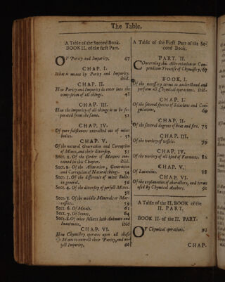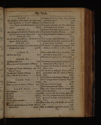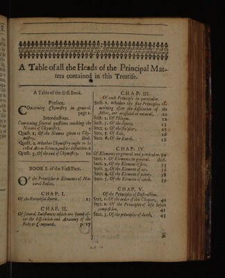 ![\ TPE EE TITI EI ENT TE NET E SEE ie A. Table ofall the Heads of the Principal Mate ters contained in this Treatife, À Table of the firft Book. . CoH Av Ps TEE Of each Principle in particular. Prefice.: | Sect. 1: Wherher the five Principles re Gn Chymifiry in. general. | maining after the diffolution of. the & page ri}, A4ixt, are artificial. or natural... -20.. Introduction; . Sect. 2. Of Phlegm. . | 23: Containing feveral queftions touching the|Sec. 3. Of the Spirir, : - - 23 Nature of Chymiftry. . g 4 Sect. 4. Of the Su'phury. 25 Queft. 1; Of the Names given to Chy- Sece, §. Of Sale, 26: | Sect. 6, Of the Earth. 28. Queft, 2. Whether Chymifiry ought to Le]. | called Art or Science audits definition. 6 | . Queft. 3. Of the end of Chymifry. 10 CHAP TY, Of Elementsin general and particular. 30> Sect: 1. Of Elements in general. ibid. Sect..2..Of rhe Element of fire, 33 Sect. 3: Of the Element of air. 36 Sect: 4, Of the Element of waters … 38 Sect. 5; Of the Element of earth. 39: BOOK I. of the Fir Part. : @ F the Principlesor Elements of Na- tural Bodies, . CHAD. V. CHAP, Ie. Of the Principles of Def ra€tion, - : Of the Lniverfal. Spirit. . | 13 |Sect,1. Of the order of this Chapter, . 40° | TRS Sect. 2. Of the Principles of life. before CHAP. TIS. compofrion. > Of feveral. Subftances which are found-af- ter the diffulntion and Anatomy of the A Sect, 3..Of the principles of death, 43 - Bedy or Componnds. ps 27l =](https://iiif.wellcomecollection.org/image/b33479239_0321.jp2/full/800%2C/0/default.jpg)