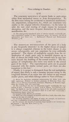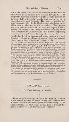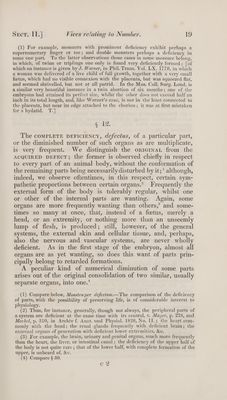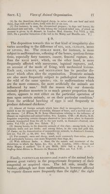 ![(4) In the American short-legged sheep, in swine with one hoof and with three, dogs with wolf’s claws, fowls with five or six toes. (5) For instance, in man, the circumcised prepuce; in dogs and horses, the shortened ears and tails. ['To this belong the crooked-tailed cats, of which an account is given by G. Bennett, in London Med. Gazette, Vol. VIII. p. 332. 1831, On a peculiar formation of the tail in the Malay and Manilla cats. T.] § 9. The disposition towards this or that kind of irregularity also varies according to the difference of sex, AGE, CLIMATE, MODE OF LIvING, &c. ‘The FEMALE Bopy, for instance, is more subject to malformations, softening of the bones, spurious forma- tions, especially fatty tumours, cancer, femoral rupture, &c. than the MALE BoDY, which, on the other hand, is more frequently affected with aneurysms, inguinal ruptures, and, on account of the mode of living, with mechanical lesions. Each AGE, CLIMATE, and occupaATIoN has its peculiar dis- eases’ which often alter the organization. Domestic animals are also more frequently subject to pathological states than the wild of the same species; viz. to malformations which are the more common, the more artificially the animals are influenced by man.’ Still the reason why our domestic animals produce monsters in so much greater proportion than others, appears to rest either on the particular operation of man upon certain animals, or on their particular condition.’ Even the artificial hatching of eggs is said frequently to produce deformed chickens.* (1) Almost all foreign animals which have died in menageries, have pre- sented to me the appearance of scrofula, diseases of bone, and a morbid state of the viscera. [4. Wilson, M. D. Some Observations relating to the influence of climate on vegetables and animal bodies. 8vo. London. 1780.—M. Roulin, M.D. Inquiries respecting certain changes observed to have taken place in domestic animals transported from the old to the new world, in Jamieson’s Journal, new series. Vol. VII. p. 326. 8vo. Edinb. T.] (2) Among beasts, in the domestic animals of this class; among birds, in the domestic fowls and pet birds; and among fishes, in the carp and gold fish. [ F. Cuvier, on the domestication of mammiferous animals, in Jamieson’s Journal, new ser. Vol. IV. p. 60, 292. 8vo. Edinb. T.] (3) For example, oxen and sheep, much more commonly than swine, goats, and particularly horses; cats more frequently than dogs, &c. (4) With deficient limbs. v. Shaw, On the nature and treatment of the distortions to which the Spine, &c. 8vo. p. 39. London. 1823.—Gerson and Julius Magaz. d. auslind. Lit. d. ges. Heilk. 1824. Tuli u. Aug. p. 91.— Geoffroy-Saint- Hilaire in Memoirs du Museum d’Hist. nat. Vol. XIII. § 10. Finally, PARTICULAR REGIONS and PpaRTs of the animal body present great variety in the proportionate frequency of their congenital or acquired vices. The left side, usually the weaker, although not from malformation, is however affected by organic disease more frequently than the right;’ the right €](https://iiif.wellcomecollection.org/image/b33489166_0001_0031.jp2/full/800%2C/0/default.jpg)