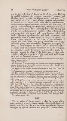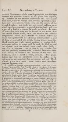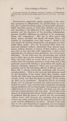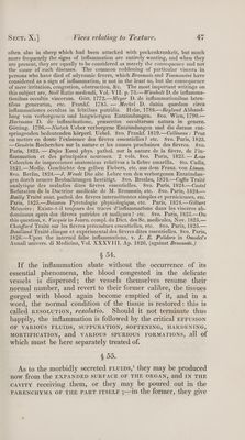 ![often also in sheep which had been attacked with pockenkrankeit, but much more frequently the signs of inflammation are entirely wanting, and when they are present, they are equally to be considered as merely the consequence and not the cause of such diseases. The common reddening of particular viscera in persons who have died of adynamic fevers, which Broussais and Tommassini have considered as a sign of inflammation, is not in the least so, but the consequence of mere irritation, congestion, obstruction, &c. The most important writings on this subject are, Stoll Ratio medendi, Vol. VII. p. 73.— Wienholt D. de inflamma- tionibus occultis viscerum. Gott. 1772.—Meyer D. de inflammationibus laten- tibus generatim, etc. Frankf. 1785. — Meckel D. dubia quedam circa inflammationes occultas in febribus putridis. Hale, 1788.—Reyland Abhand- lung von verborgenen und langwierigen Entziindungen. 8vo. Wien, 1790.— Hartmann D. de inflammatione, presertim occultarum natura in genere. Gotting. 1796.—Nietsch Ueber verborgene Entziindungen und die daraus ent- springenden bedeutenden korperl. Uebel. 8vo. Frankf. 1819.—Collineau : Peut on mettre en doute l’existence des fiévres essentielles? etc. 8vo. Paris, 1823. —Gendrin Recherches sur la nature et les causes prochaines des fiévres. 8vo. Paris, 1823. — Dujes Essai phys. pathol. sur la nature de la fiévre, de ]’in- flammation et des principales neuroses. 2 vols. 8vo. Paris, 1823.— Laso Coleccion de inspecciones anatomicas relativas a la fiebre amarilla. 4to. Cadiz, 1821.—Medic. Geschichte des gelben Fiebers, etc. aus dem Franz. von Liman. 8vo. Berlin, 1824.—J. Wendt Die alte Lehre von den verborgenen Entziindun- gen durch neuere Beobachtungen bestatigt. 8vo. Breslau, 1824.—Cafin Traité analytique des maladies dites fiévres essentielles. S8vo. Paris, 1824.—Castel Refutation de la Doctrine medicale de M. Broussais, etc. 8vo. Paris, 1824.— Bailly Traité anat. pathol. des fiévres intermittentes simples et pernicieuses, etc. Paris, 1825.—Boisseau Pyretologie physiologique, etc. Paris, 1824.—Gilbert Mémoire: Existe-t-il toujours des traces d’inflammations dans les viscéres ab- dominaux aprés des fiévres putrides et malignes? etc. 8vo. Paris, 1825.—On this question, v. Vacquie in Journ. compl. du Dict. des Sc. medicales, Nov. 1825.— Chauffard Traité sur les fiévres prétendues essentielles, etc. 8vo. Paris, 1825.— Bouilland Traité clinque et expérimental des fiévres dites essentielles. 8vo. Paris, 1826.—Upon the internal false inflammations, v. LZ. E. Polidoro in Omodei’s Annali univers. di Medicina, Vol. XX XVIII. Ap. 1826, (against Broussais. ) § 54, If the inflammation abate without the occurrence of its essential phenomena, the blood congested in the delicate vessels is dispersed; the vessels themselves resume their normal number, and revert to their former calibre, the tissues gorged with blood again become emptied of it, and in a word, the normal condition of the tissue is restored: this is called RESOLUTION, resolutto. Should it not terminate thus happily, the inflammation is followed by the critical EFrusIon OF VARIOUS FLUIDS, SUPPURATION, SOFTENING, HARDENING, MORTIFICATION, and VARIOUS SPURIOUS FORMATIONS, all of which must be here separately treated of. § 55. As to. the morbidly secreted rLurps,’ they may be produced now from the EXPANDED SURFACE OF THE ORGAN, and IN THE cavity receiving them, or they may be poured out in the PARENCHYMA OF THE PART ITSELF ;—in the former, they give](https://iiif.wellcomecollection.org/image/b33489166_0001_0061.jp2/full/800%2C/0/default.jpg)
