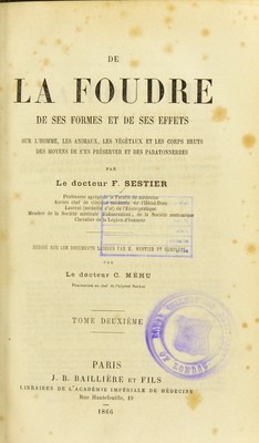 De la foudre, de ses formes, et de ses effets : sur l'homme, les animaux, les vegetaux et les corps bruts, des moyens de s'en preserver et des paratonnerres / Par le docteur F. Sestier ... Redige sur les documents laisses par M. Sestier ; et complete par le docteur C. Mehu.