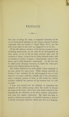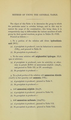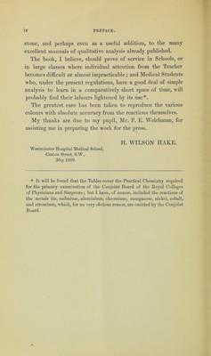 Coloured analytical tables : showing the behaviour of the more common metals and acids to the ordinary reagents, with special reference to the colour of the various oxides, salts, precipitates, flames, borax-beads, and blowpipe reactions a class-book for students in hospitals, colleges and schools / by H. Wilson Hake.