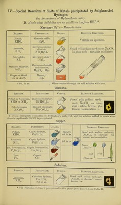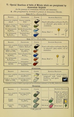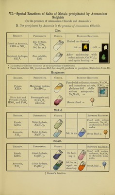Credit: Coloured analytical tables : showing the behaviour of the more common metals and acids to the ordinary reagents, with special reference to the colour of the various oxides, salts, precipitates, flames, borax-beads, and blowpipe reactions a class-book for students in hospitals, colleges and schools / by H. Wilson Hake. Source: Wellcome Collection.