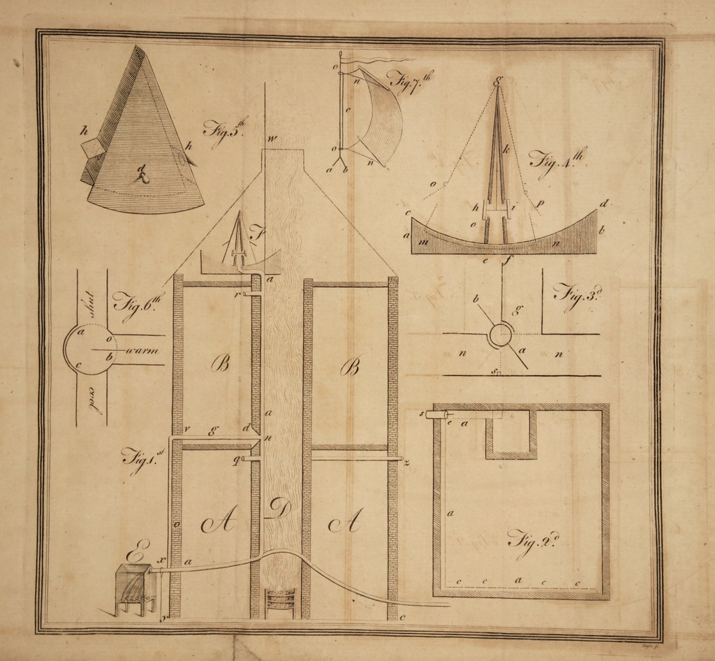 Credit: A philosophical estimate of the causes, effects and cure of unwholesome air in large cities. With a ... mode of supplying with perpetual warm, or cool fresh air, churches ... hospitals, ships, houses ... sick rooms, etc. To which is prefixed, a philosophical dissertation on the causes and cure of smoking chimnies / [A. Walker]. Source: Wellcome Collection.