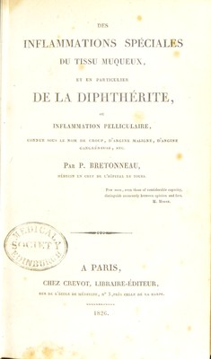 Credit: Des inflammations spéciales du tissu muqueux, et en particulier de la diphthérite, ou inflammation pelliculaire. Connue sous le nom de croup, d'angine maligne, d'angine gangréneuse, etc / [Pierre Fidèle Bretonneau]. Source: Wellcome Collection.