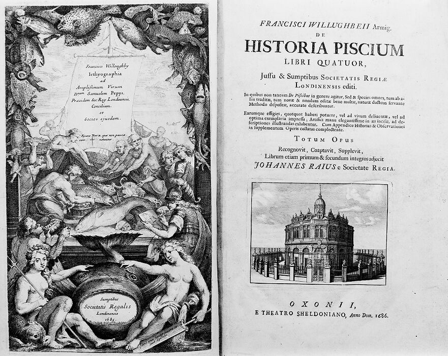 Credit: M0012484: Frontispiece and title page from <i>De Historia Piscuim…</i>, 1686. Source: Wellcome Collection.