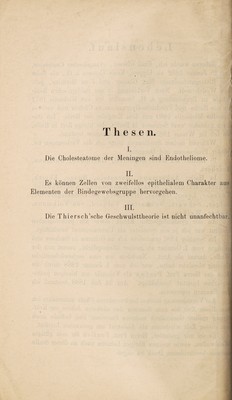 ![Thesen. i. Die Cholesteatome der Meningen sind Endotheliome. • II. Es können Zellen von zweifellos epithelialem Charakter aus Elementen der Bindegewebsgruppe hervorgehen. III. Die Thiersch’sche Geschwulsttheorie ist nicht unanfechtbar.]](https://iiif.wellcomecollection.org/image/b30584553_0040.jp2/full/800%2C/0/default.jpg)